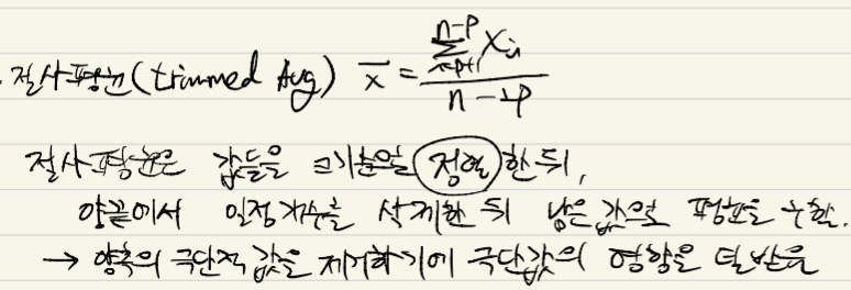 절사평균은 평균이 특이값, 극단값의 영향을 받는다는 점을 고려하여 상위/하위 데이터 중 p개를 제거하고 평균을 구하는 방법이다. 만일 n개의 데이터가 있고, 상위에서 p개, 하위에서 p개를 제거한다면, 아래와 같은 수식으로 값을 구할 수 있다.