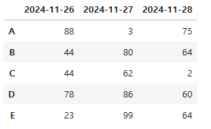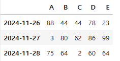 df = pd.DataFrame(np.random.randint(1,100,(3,5)), index = dates, columns = list('ABCDE'))