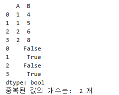A열을 기준으로 0번째 행과 동일한 데이터가 1번 행에도 있기에 True가 나오게 되었음.