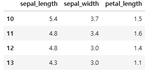 Q) 행이 10이상 14미만, 컬럼이 0이상 3미만인 데이터를 추출하시오