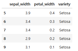 df.loc[5:9,['sepal_width', 'petal_width','variety']]