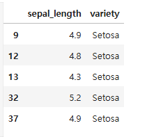 Q) 'petal_width'<0.2 인 데이터들 가운데 'sepal_length', 'variety'를 추출하시오