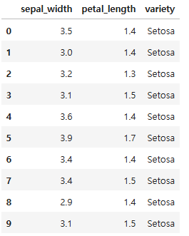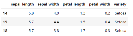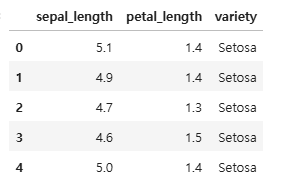 Q) 'variety' == 'Setosa' 일때, 'sepal_length', 'petal_length', 'variety' 데이터를 추출하시오