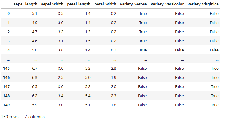 이에, get_dummies를 실행하면, variety_Setosa, variety_Versicolor, variety_Virginica가 생겨나고